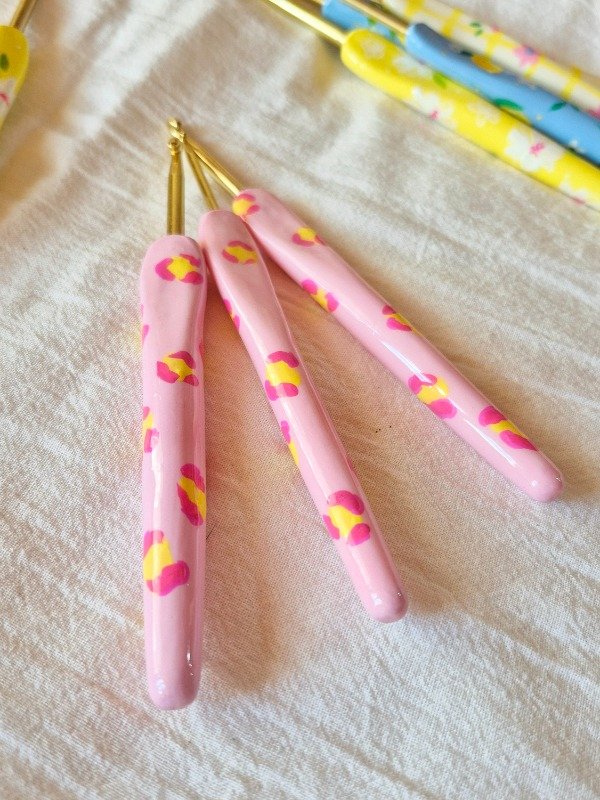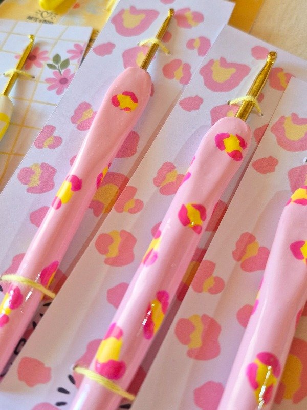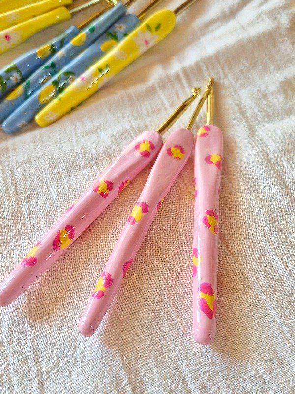 Cada varita está amasada y pintada a mano, con terminación en barniz que la deja brillante, resistente y lista para acompañarte en todos tus tejidos.