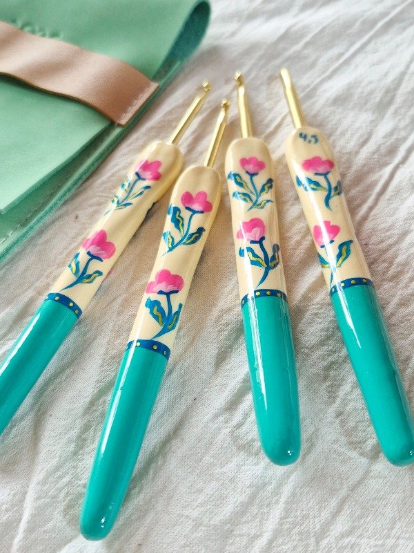 Este kit reúne 4 varitas de crochet únicas, hechas y elegidas especialmente para combinar con su estuche.